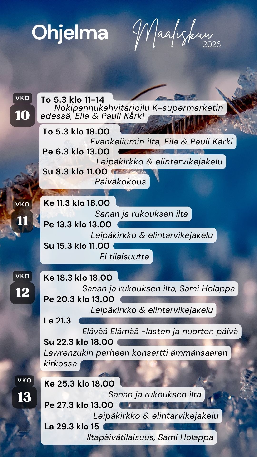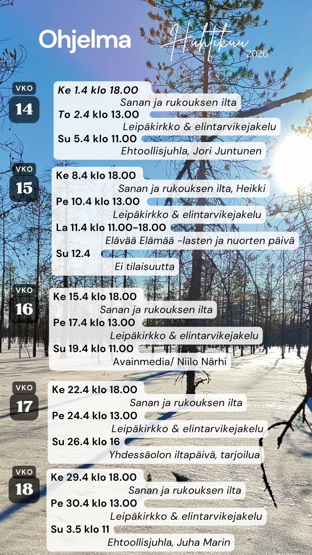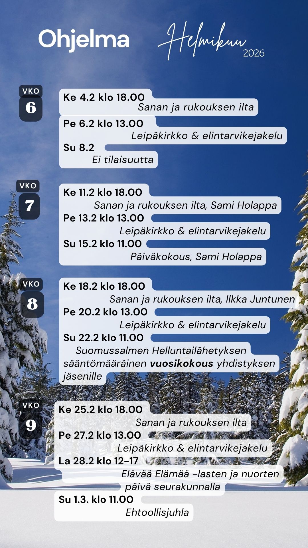 Tältä sivulta löydät seurakuntamme ajantasaisesti päivittyvät tapahtumat ja tilaisuudet.